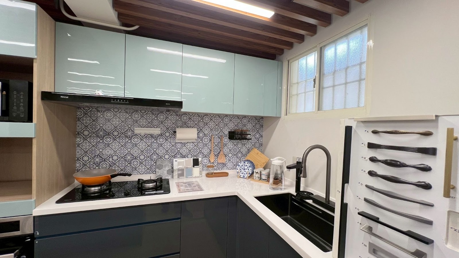選擇廚房壁面,不僅要考量單一材質,更需要與廚具門板、檯面材質(人造石、石英石等)進行搭配。
