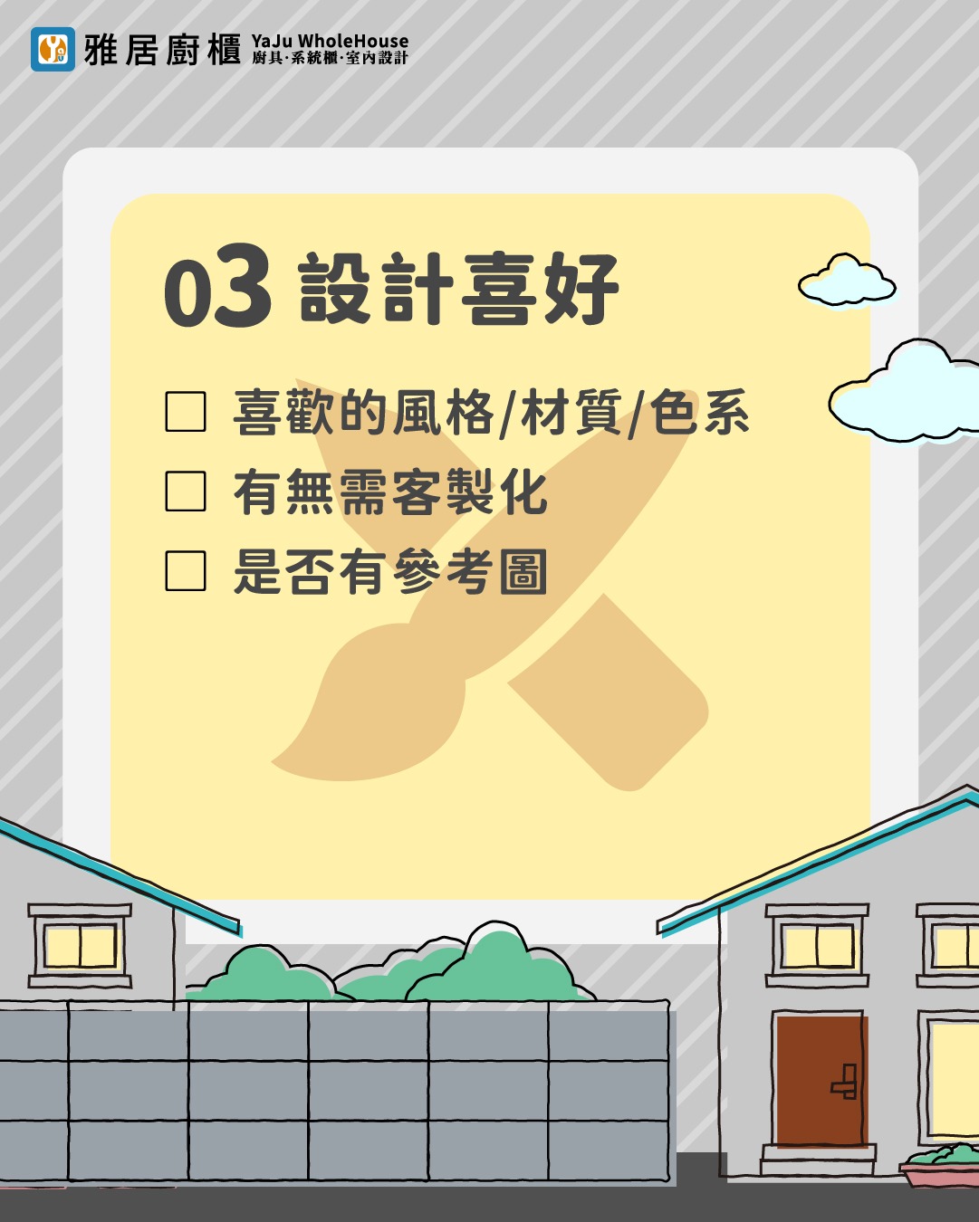 施作項目確認: 除了廚具,您是否也需要雅居協助您規劃家中的系統櫃、木作或其他裝修項目呢?一次性的溝通,讓您的整體設計更和諧。