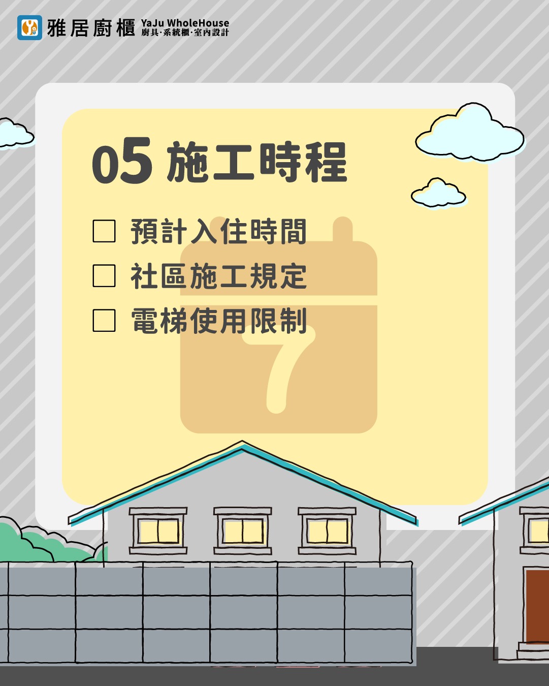 如果您屬於社區大樓,請事先了解社區是否有施工時間限制、假日是否可施工,或電梯是否有大小或使用時段限制,讓工班進場時能更順暢、不打擾鄰居。