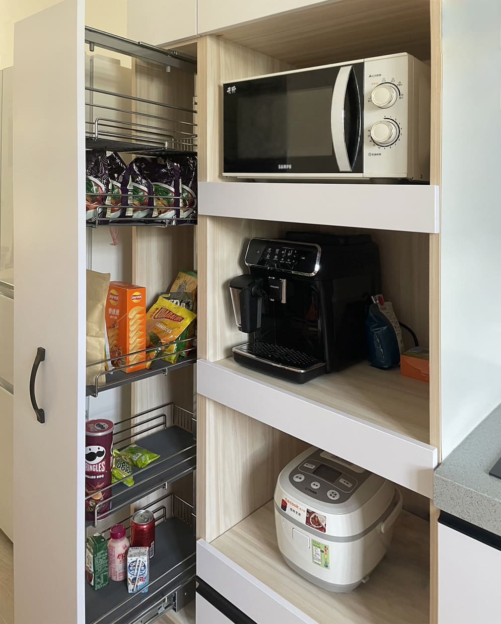 TIPS: 善用廚櫃內部的五金拉籃與抽屜,讓物品好收又好找,徹底降低料理時的混亂場面。