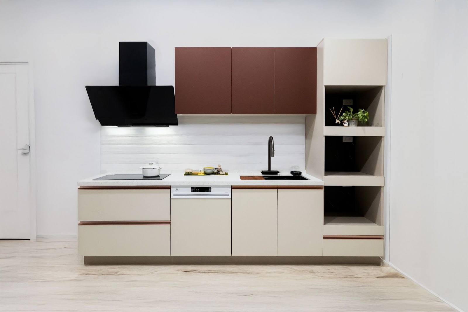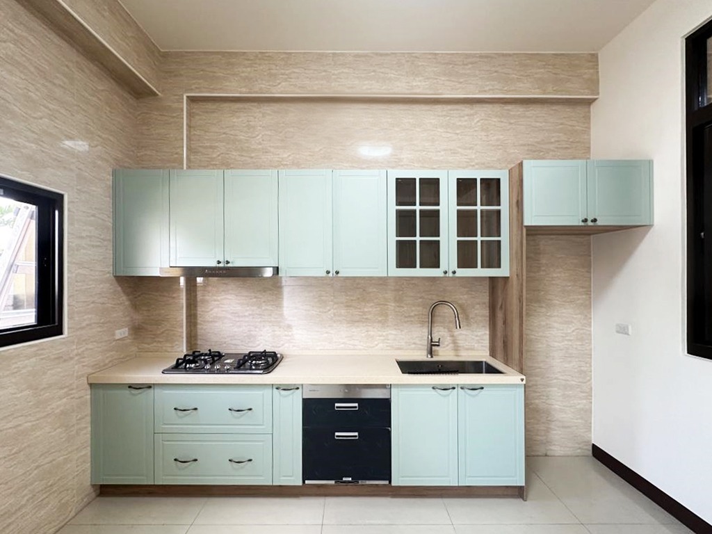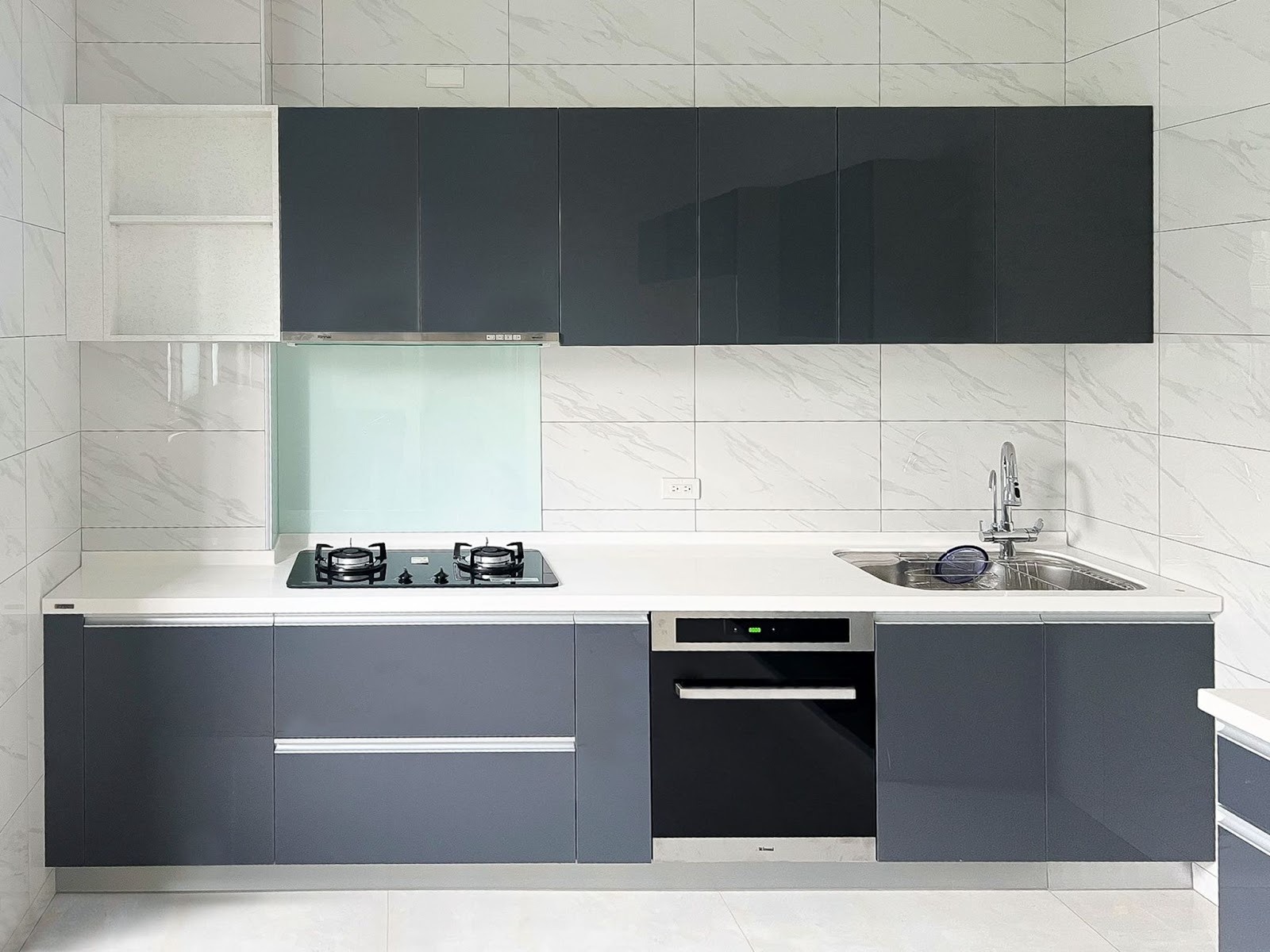 花色統一: 可以讓廚房門片跟客廳電視櫃、臥室衣櫃用同一塊板材,全室風格一致。